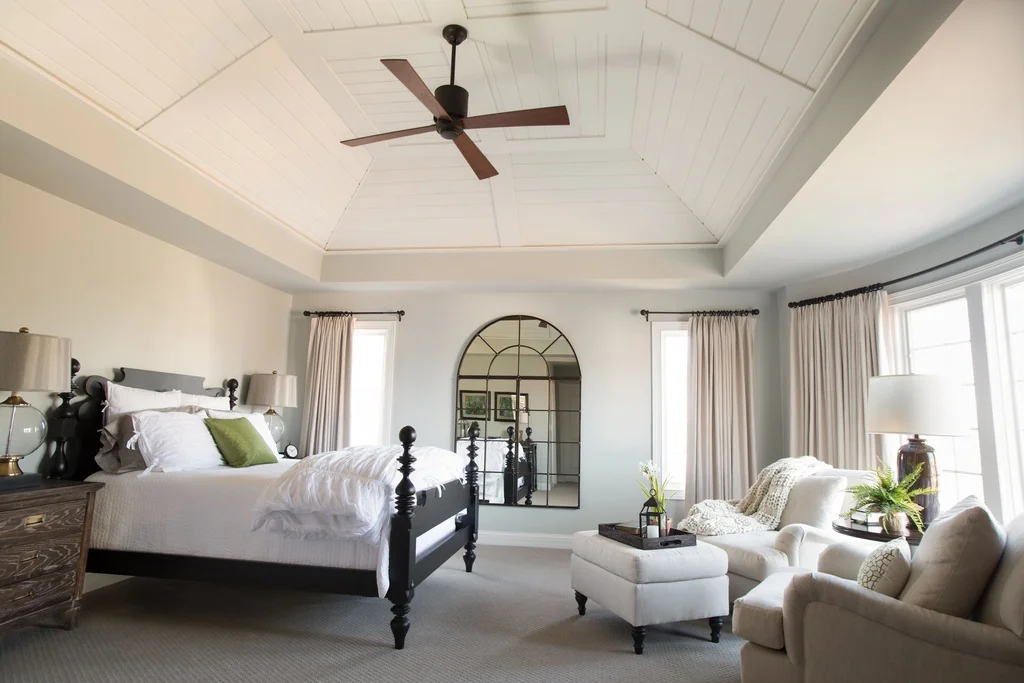 This detailed tray ceiling is finished with painted shiplap boards. By bringing the framing up, the room feels more open and gives the illusion of a much larger space. What a beautiful light, elegant bedroom.